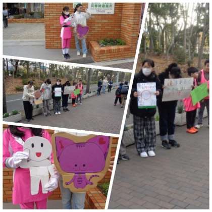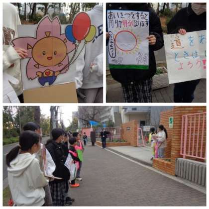 今朝のあいさつ週間の様子です。予報通り寒さの厳しい朝になりましたが、児童会のみなさんはとてもがんばっていました。本日のめあては「自分からあいさつしよう」でした。昨日紹介した「さくらもち」も早速活躍していました。