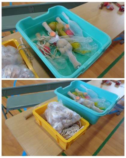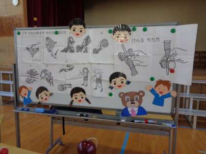 1年生が昔遊びの体験をしました。体験した遊びは「けん玉」と「コマ回し」です。子どもたちは、ゲストティーチャーの先生の模範演技(これがとてもすごかったのですが…)を観た後に、それぞれの遊びの基本的な技にチャレンジしました。