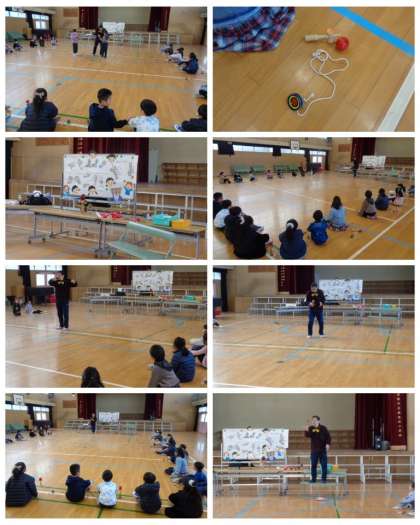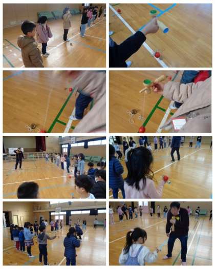 子どもたちが、けん玉にチャレンジをしている様子です。けん玉の正しい持ち方を教えてもらった後、大皿に玉をのせる技から練習しました。膝でリズムをとることが、成功するコツだということを知ることができました。