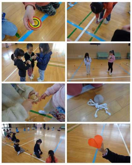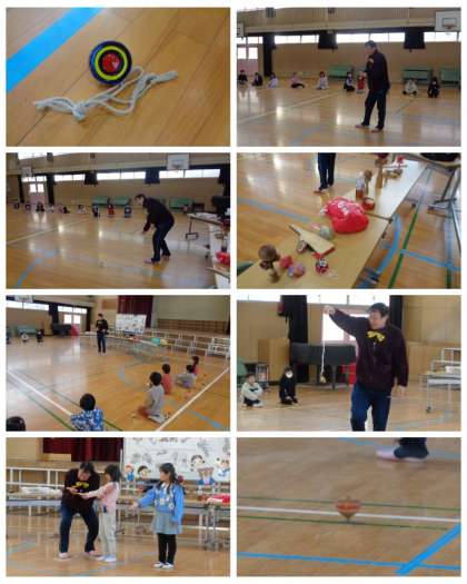 続いて、こま回しをしている様子です。コマにひもを正しく巻くことが、とても難しかったようです。子どもたちは、失敗を繰り返しながらも粘り強く取り組んでいました。また、使った後の正しい片づけ方も教えてもらいました。