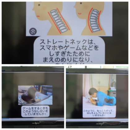 今週は姿勢ウィークです。初日は、給食の時間に保健委員会の人たちが制作した、姿勢に関する動画を観て、姿勢が体に与える影響や体をほぐすことの大切さについて考えました。