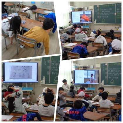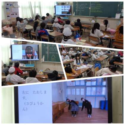 姿勢ウィーク2日目の様子です。2日目は、初日と同様に保健委員会の人たちが制作した、体をほぐすための運動などを紹介をする動画を観ました。各教室では、動画を観ながら動きの真似をする姿が見られました。