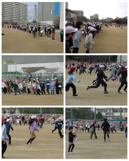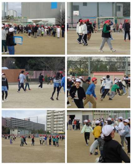 今週の集会は鬼ごっこでした。集会委員会の人が鬼役の先生と学年、逃げ役の学年を指定するところからゲームが始まります。鬼に捕まった逃げ役の人が帽子の色を変えて鬼役になる、増えオニのルールで行われていました。制限時間は2分間でしたが、最後まで逃げ切るのはとても難しそうでした。