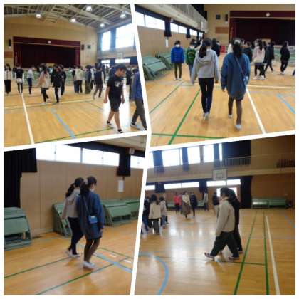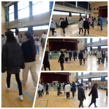 6年生が卒業式に向けての練習を始めています。写真は、隣の人と動きを合わせながら、入場をする練習に取り組む様子です。