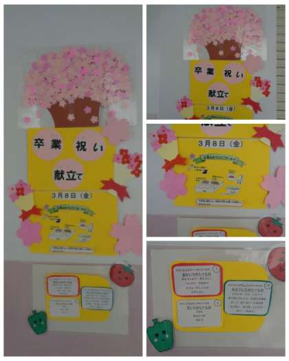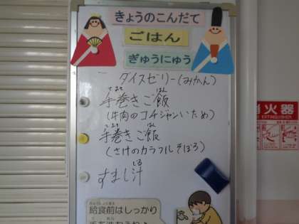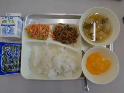 今日の給食は「卒業祝い献立」でした。メインは具材をご飯といっしょに海苔で巻いて食べる「手巻きご飯」でした。具材には「牛肉のコチュジャンいため」と「しゃけのカラフルそぼろ」の2種類がありました。