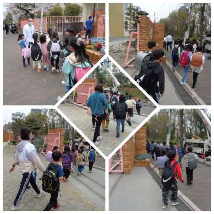 始業式の日は、緊急時の対応のための訓練として、集団下校を行います。教職員の引率のもと、同じ方向に帰る子どもたちがかたまって下校します。災害などの発生により、緊急下校の対応が必要な場合は、この体制をとります。