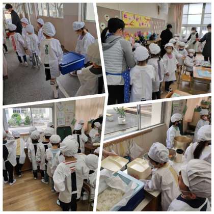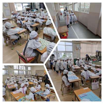1年生にとって、小学校生活で初めての給食がありました。初めてでも、できることは自分たちでやります。おかずやご飯を給食室にとりに行くのも、たくさんの先生に手伝ってもらいながら、みんなで協力してやりました。当番以外の人も、きちんと座って静かに待つことができていました。