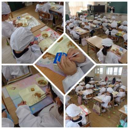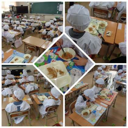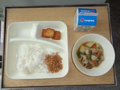 いよいよ待望のいただきますです。「おいしい」という声が、教室のあちらこちらから聞こえてきました。初めての献立は、鶏肉とじゃがいもの煮もの・あつあげのしょうゆだれがけ・紅ざけそぼろ・ごはん・牛乳でした。