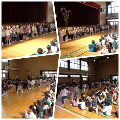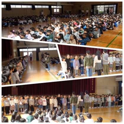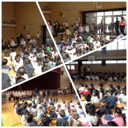 1時間目に、1年生と2年生より上の学年の子どもたちが、初めて顔を合わせる「対面式」が講堂でありました。1年生の入場を拍手で迎えることから、式が始まりました。校長先生の話に続いて、6年生の代表児童による歓迎の言葉がありました。1年生の子どもたちも「よろしくおねがいします」と、大きな声であいさつすることができていました。