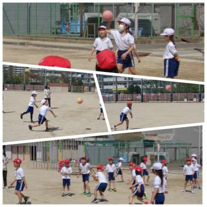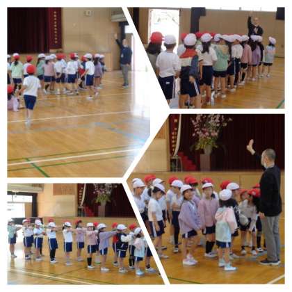 新年度をむかえ、新しい学年での学習も始まっています。まずは2年生の体育の学習の様子です。1組は体育館で集団行動について、2組は運動場でボールを使う運動の学習に取り組んでいました。