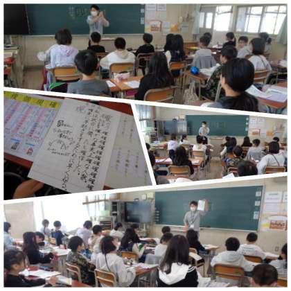5年生が、漢字学習の進め方について学習していました。漢字学習は、家庭学習でも取り組みます。使用例のプリントを参考にしながら、漢字ノートの使い方について、ていねいに説明が行われていました。