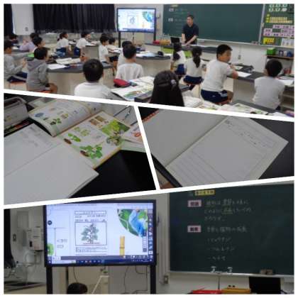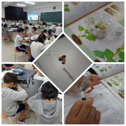 4年生が理科で、植物の成長について学習をしていました。観察記録の重要なポイントを確認をした後、成長を観察する植物の種を、虫眼鏡を使って観察していました。