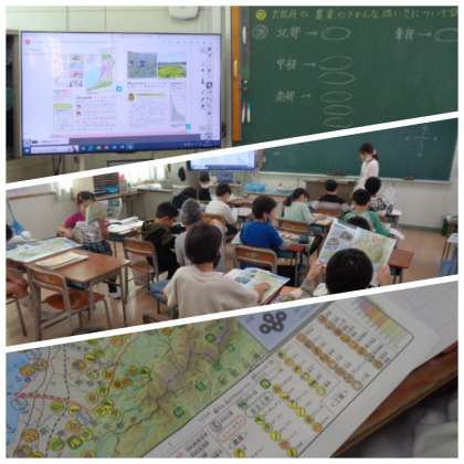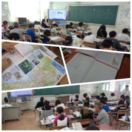4年生は社会科で大阪府の特色について学習しています。地図を見ながら、府内のそれぞれの地域で作られている農産物を調べていました。