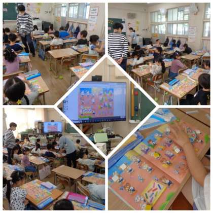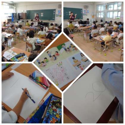 2時間目の1年生の学習の様子です。どちらのクラスも算数の学習をしていました。1組は、教科書にある絵を使って、数を数える学習に取り組んでいました。2組は、数字を読んだり書いたりする学習をしていました。