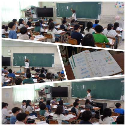 4年生が、算数でわり算の学習をしていました。「たてる」「かける」「ひく」「おろす」の手順を確認しながら、ひっ算のしくみについて考えていました。