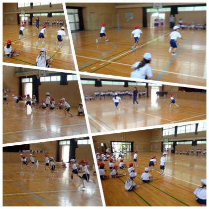 1年生が体育館で、かけっこの学習をしていました。「位置について」「ヨーイ」の指示で準備をして、「スタート」の合図で勢いよく飛び出す練習を、繰り返し行っていました。