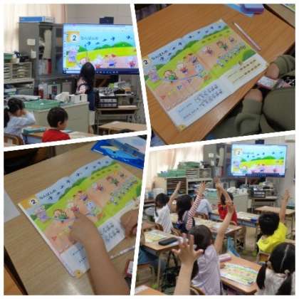 1年生が算数で、数え方の学習に取り組んでいました。教科書の絵を観ながら、先生が指定する動物を探しながら、前から〇番目や後ろから〇番目という数え方について考えていました。