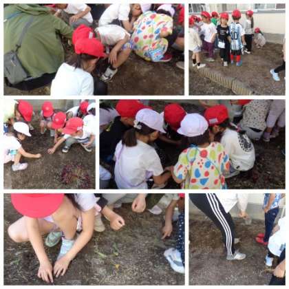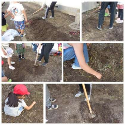 1年生が学習園の整備に取り組んでいました。草むしりをしたり耕したりしながら、畑づくりをがんばっていました。整備した学習園には、おしろい花やオクラを植える予定になっています。