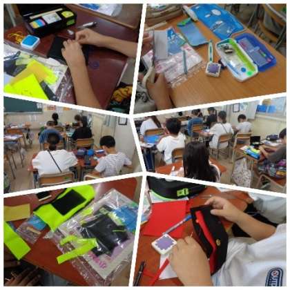 5年生が家庭科で裁縫の学習に取り組んでいます。カラフルなフエルトを使って、筆箱などの小物づくりをしていました。