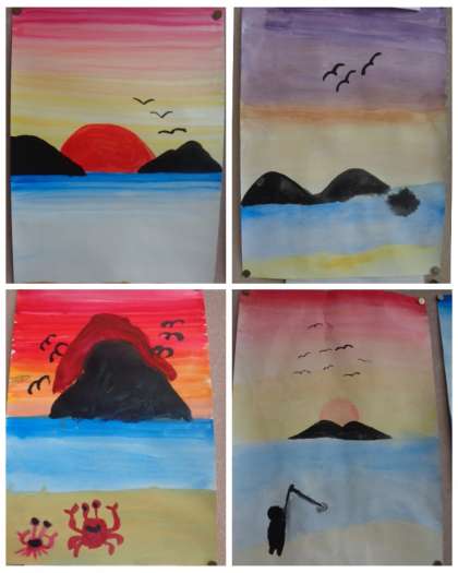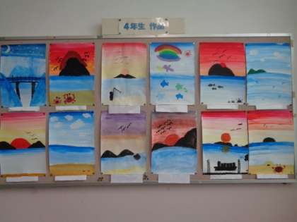 4年生の掲示板です。絵の具の濃淡で表現されたグラデーションを駆使した、きれいな風景の絵が飾られています。