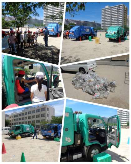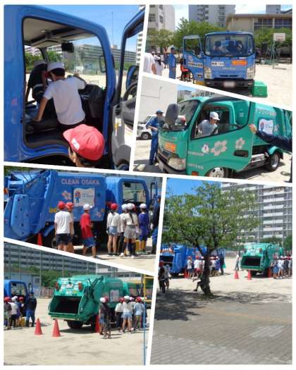 大阪市の環境事業局の方にお越しいただいて、4年生がパッカー車体験の出前授業を行いました。パッカー車に乗せていただいたり、ごみ収集の疑似体験などをさせていただいたりしました。出前授業を通して、環境を守る取り組みの大切さについて学ぶことができました。