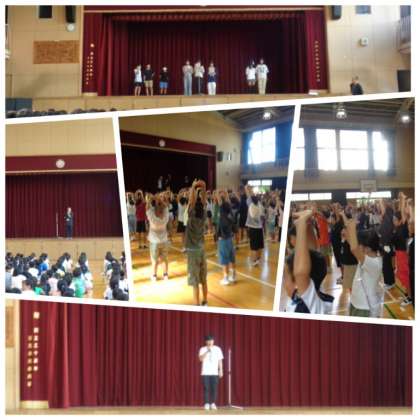 2学期最初の朝会がありました。本日の朝会では、社会を明るくする運動の標語と算数オリンピックで賞をもらった児童の表彰がありました。また、給食委員会からのお知らせや保健委員会の人たちとともに姿勢を伸ばす運動をするなど、盛りだくさんの内容でした
