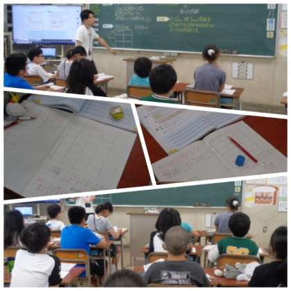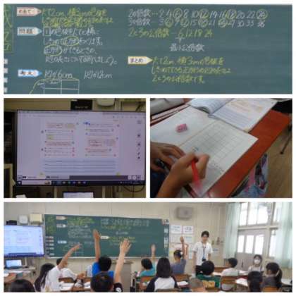 5年生が算数で倍数の学習に取り組んでいました。2数の公倍数の求め方を考えながら、一番小さい数が最小公倍数になることを確認していました。