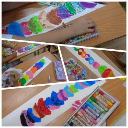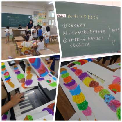 1年生がパスを使って、アイスクリームをモチーフにした絵を描いていました。縦長の画用紙に、たくさんのアイスクリームを積み重ねながら、美味しそうに見せる工夫を考えていました。