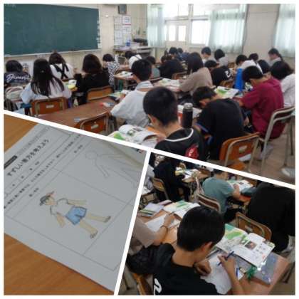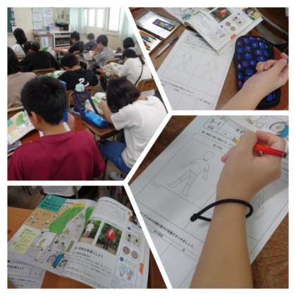 6年生が家庭科の学習で、暑さをしのぐための服装の工夫について考えていました。今の時期には熱中症を防ぐという観点からも、大切な学習になります。ワークシートに、それぞれが工夫した服の着方を表現していました。