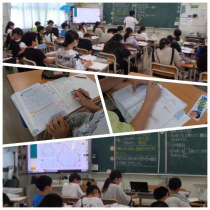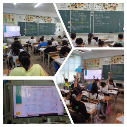 6年生が算数で「図形の拡大・縮小」の学習をしていました。もとになる図形を、形を変えずに拡大する方法について考えていました。