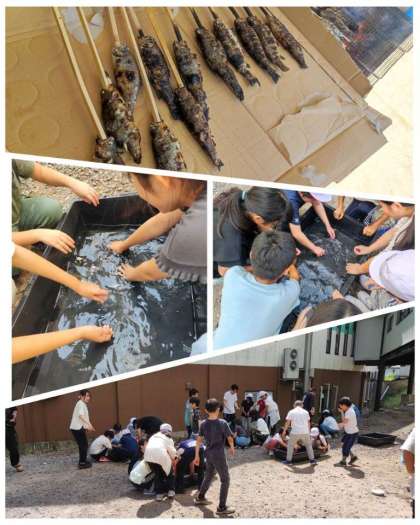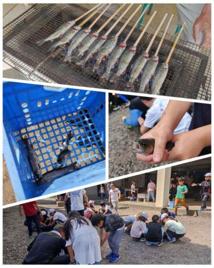 つかんだ魚は、その場で宿舎の方に串を打ってもらって、塩焼きにして食べます。