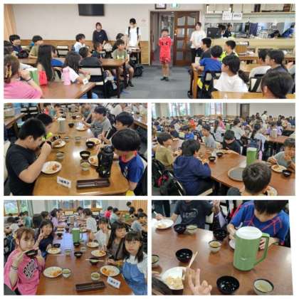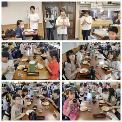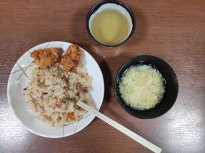 魚つかみの後は、お昼ご飯です。名色ホテルでの最初の食事になります。お昼ご飯のメニューはかやくご飯と唐揚げでした。朝から食べてばかりになりますが、みんなしっかりと食べていました。