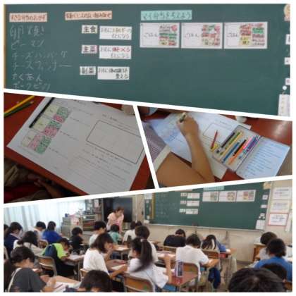 6年生で栄養指導がありました。栄養のバランスがとれた、マイ弁当を考える内容の学習でした。各自が主食と主菜と副菜の比率が理想とされる3:1:2になるマイ弁当を考え、ワークシートにまとめていました。