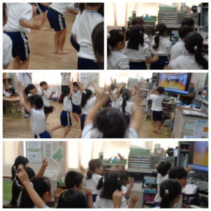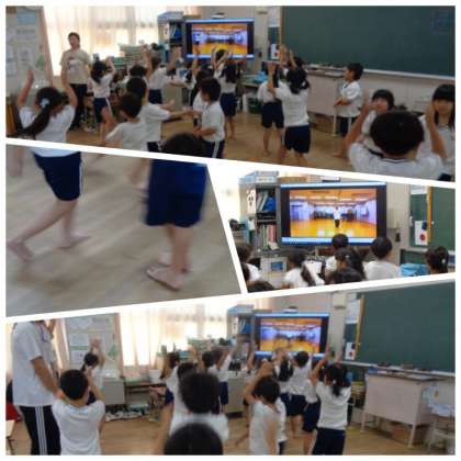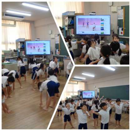 1年生が、体育の学習でダンスを楽しんでいました。もうすぐ運動会に向けての練習も始まります。熱中症対策のため教室での学習でしたが、みんな元気に踊っていました。合わせてラジオ体操の練習もしました。