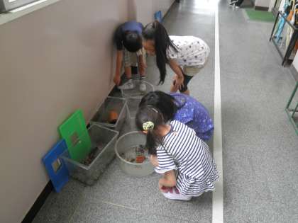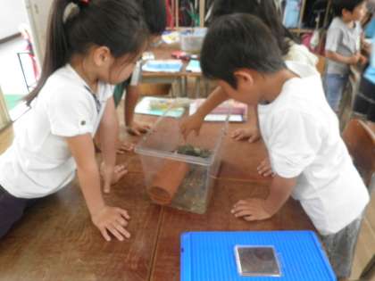 2年生の学級にザリガニがやってきました。ザリガニに興味しんしんの子どもたちです。「わあ、はさみをふりあげてるよ!!」「隠れてるよ!!」とうれしそうに観察していました。