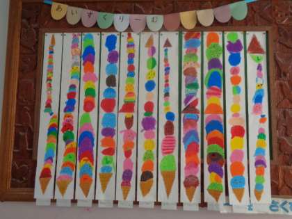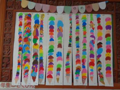 1年生の学年掲示板です。先日ホームページ紹介した「ゆめのあいすくりーむ」の完成した作品が掲示されています。