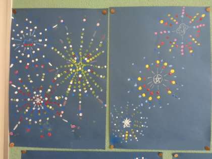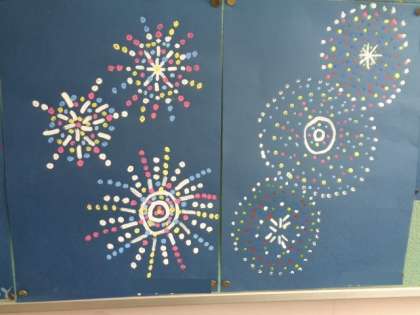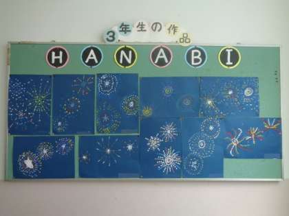 3年生の掲示板です。夜空に見立てた濃紺の画用紙の上に、きれいな花火が打ち上げられている「HANABI」の作品が掲示されています。
