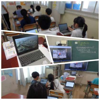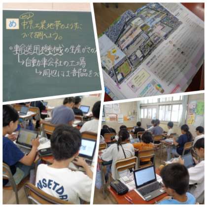 5年生が、社会科の工業地帯の学習に取り組んでいました。学習端末で検索した中京工業地帯に関する動画を視聴しながら、調べ学習を進めていました
