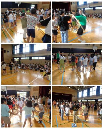 今週の児童集会の様子です。今週はたてわり班全員が手をつないで円形に並び、その状態でフラフープをくぐりながら渡していくゲームでした。各班が団結力を発揮しながらクリアしていました。