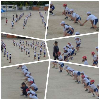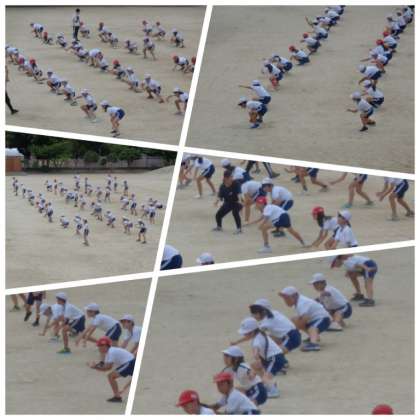 5年生の運動会の練習の様子です。運動場で団体演技で行う「よさこいソーラン」の練習に取り組んでいました。姿勢を低くすることを意識しながら、力強く踊っていました。