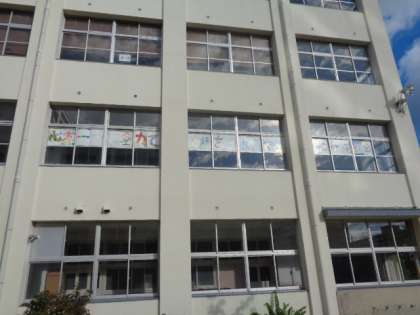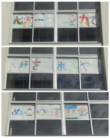 今年の運動会のスローガンは「心を一つに全力で 笑顔を忘れず やりぬこう運動会」になりました。各学級で一文字ずつ分担して書いたスローガンが、東校舎2階の運動場側の窓に掲示されています。