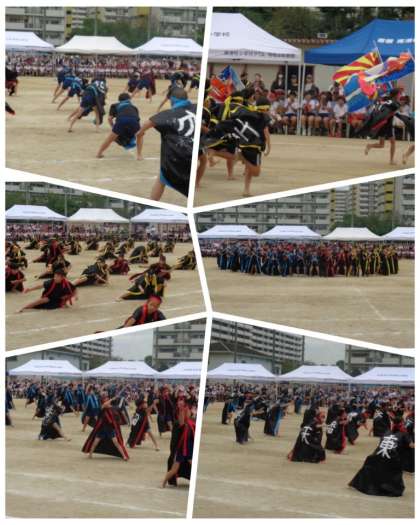 5年生は「桜小ラン節〜舞い上がれ 桜魂〜」というタイトルの団体演技と「「あっぱれ! ひっぱれ! つっぱれ!」というタイトルの棒引きを行いました。団体演技では、背中に一文字書き入れた黒いはっぴをまとい、低い姿勢を保って踊る、力強いよさこいソーランを披露しました。