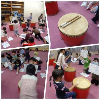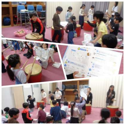 2年生が音楽で拍の学習に取り組んでいました。自分で考えたリズムを、太鼓を叩いて表現してました。