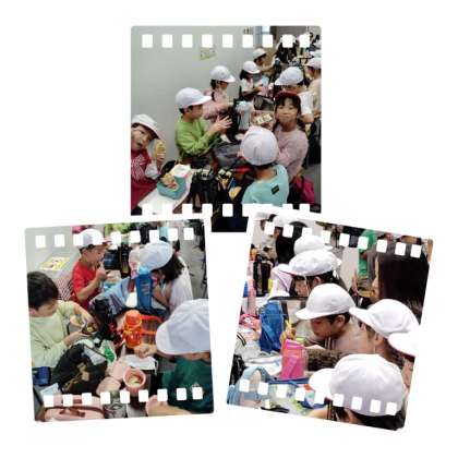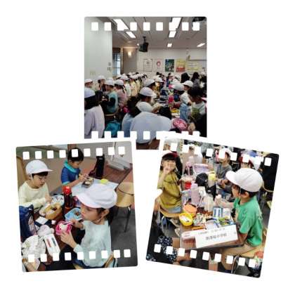 活動を終えて、お待ちかねのお弁当タイムです。晴れていれば扇町公園で昼食をとる予定でしたが、雨模様のため館内の多目的ホールでのお弁当になりました。