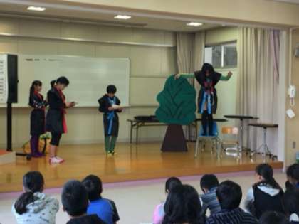 6年生は、国語科で「柿山伏」を学習しました。所作や台詞をを工夫して楽しく狂言を演じました。