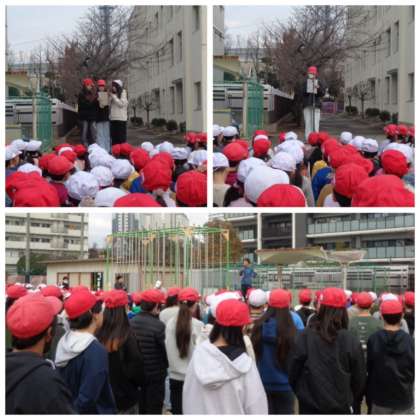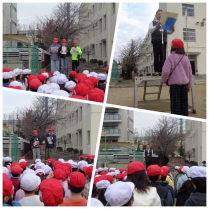 3学期初めての児童朝会がありました。朝会では最初に絵画で表彰された児童の紹介をしました。続いて、校長先生から阪神淡路大震災と給食週間のお話がありました。また、今週の朝会では、たくさんの委員会からのお知らせもありました。朝会の最後は当番の先生からの、1月の生活目標についてのお話でした。