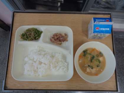 準備も終わり、いただきますの時間です。初めての献立は、ごはん、牛乳、豚肉のしょうが焼き、とうふのみそ汁、じゃこピーマンでした。