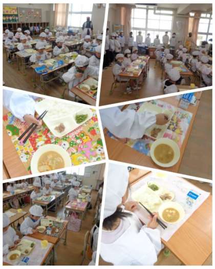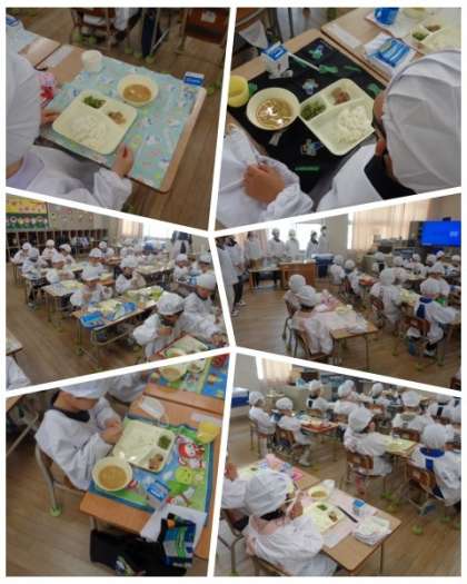 いただきますの後の様子です。初めて食べる給食でしたが、みんなしっかり食べていました。これからもおいしい給食をしっかり食べて、元気な学校生活を送るようにしましょう。