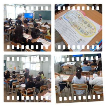 2時間目の5年生の学習の様子です。1組は家庭科で「毎日の生活をみつめよう」の学習をしていました。2組は国語で「おにぎり石の伝説」の読み取りをしていました。3組は算数で立体のかさについて考えていました。