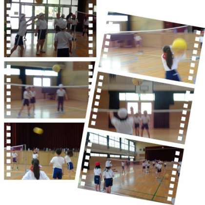 4年生が講堂でネット型ゲームのキャッチバレーボールの学習をしていました。ネットで区切られたコートを使って、それぞれが相手コートにボール投げ入れ、それを落とさないようにキャッチをするゲームです。キャッチした後に自陣でパスを回してから、相手コートに投げ入れるルールで行われていました。
